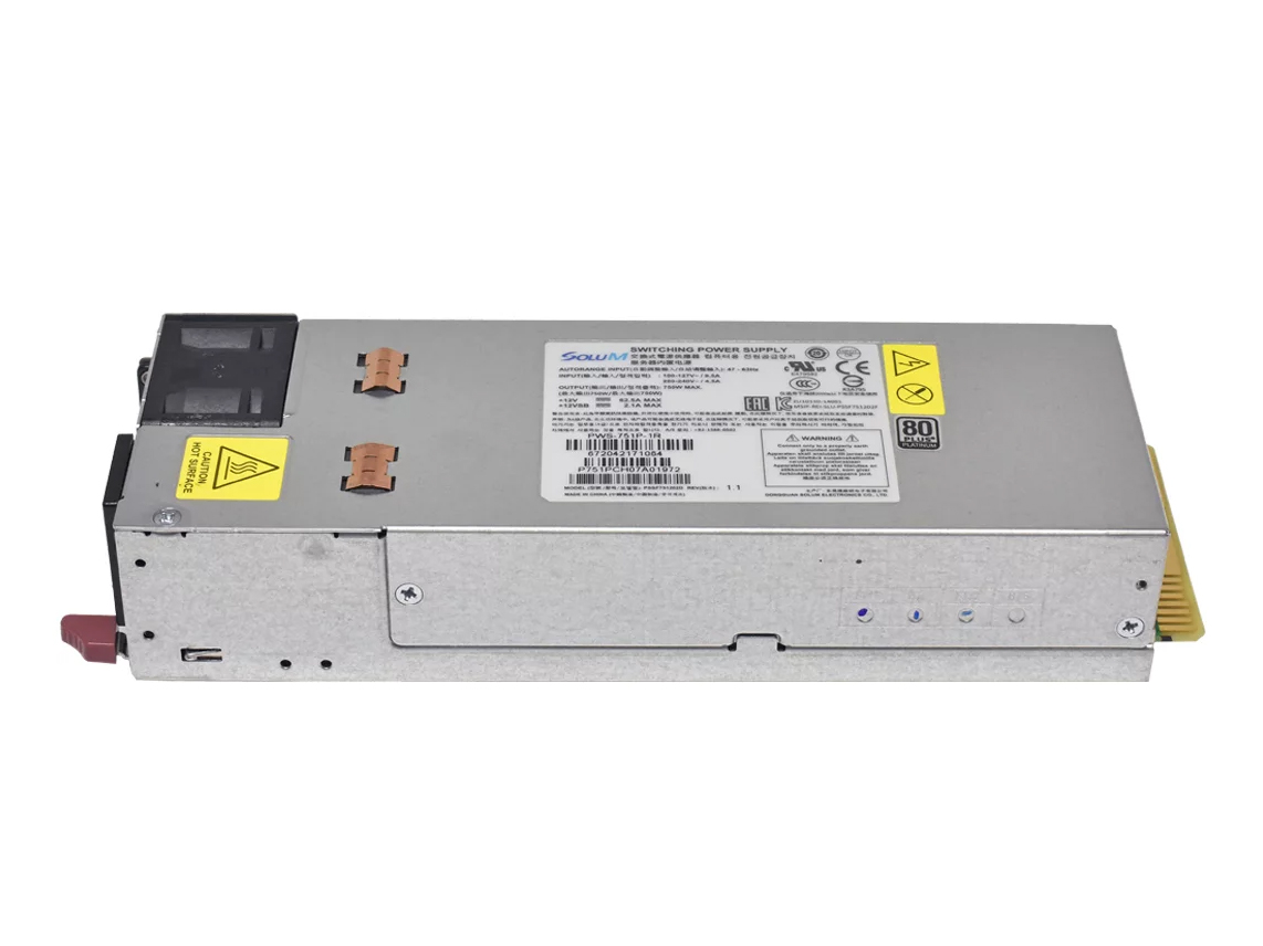 Zasilacz Supermicro SoluM PSSF751202D to modułowy zasilacz hot‑swap o mocy maksymalnej 750 W, zaprojektowany do pracy w środowiskach serwerowych jako część redundantnego układu zasilania. Urządzenie obsługuje napięcie wejściowe 100‑127 V przy prądzie do 9,5 A oraz 200‑240 V przy prądzie do 4,5 A. Na wyjściu dostarcza +12 V przy maksymalnym natężeniu 62,5 A oraz +12VSB przy 2,1 A, co sprawia, że może zasilać główne obwody systemowe oraz sekcję zasilania w trybie oczekiwania (standby). Konstrukcja typu plug‑in / hot‑swap umożliwia łatwą wymianę bez przerywania pracy serwera. Zasilacz spełnia normę 80 PLUS Platinum, co świadczy o wysokiej sprawności energetycznej. Współpracuje z obudowami i serwerami Supermicro, oferując elastyczne i niezawodne źródło zasilania w konfiguracjach redundantnych.
